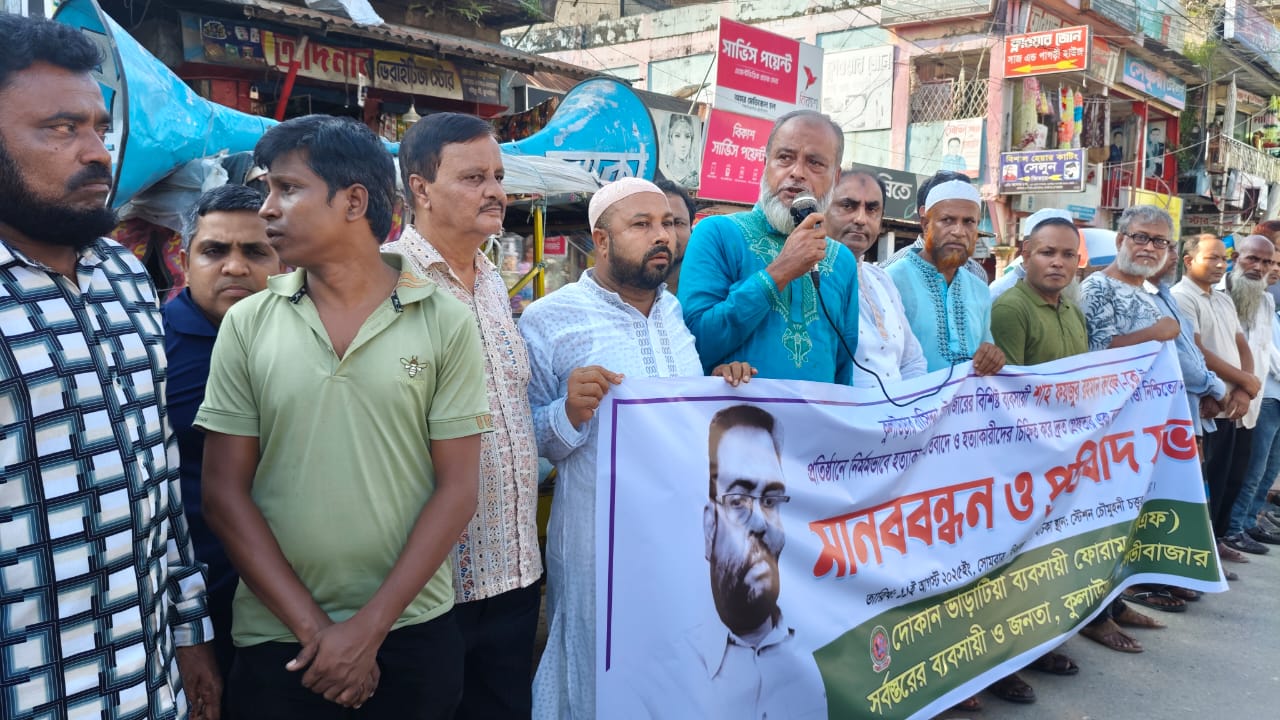 (১১ আগস্ট) সোমবার বিকেলে স্টেশন চৌমুহনী চত্ত্বরে দোকান ভাড়াটিয়া ব্যবসায়ী ফোরাম (টিবিএফ), সর্বস্তরের ব্যবসায়ী ও জনতার আয়োজনে এ মানববন্ধন ও প্রতিবাদ সভা অনুষ্ঠিত হয়।