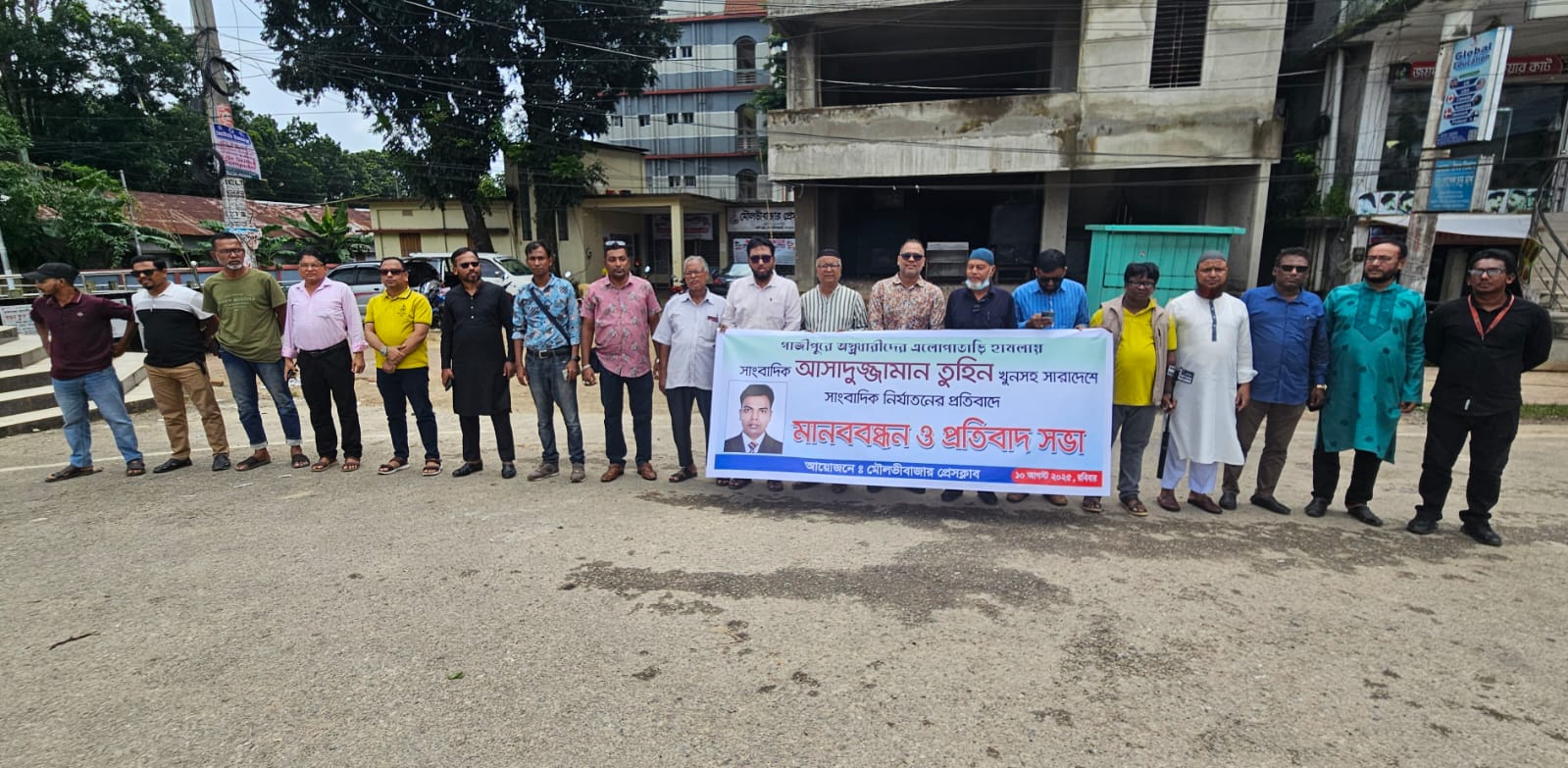 গাজীপুরে দৈনিক প্রতিদিনের কাগজ পত্রিকার সাংবাদিক আসাদুজ্জামান তুহিনকে হত্যার প্রতিবাদে ও দ্রুত সময়ে বিচার চেয়ে মানববন্ধন ও প্রতিবাদ সমাবেশ করেছে মৌলভীবাজার প্রেসক্লাব।১০ আগস্ট রবিবার দুপুর ১২টার দিকে মৌলভীবাজার প্রেসক্লাবের সামনে মানববন্ধন ও প্রতিবাদ সমাবেশ অনুষ্ঠিত হয়।ঘন্টাব্যাপী মানববন্ধনে বিভিন্ন গণমাধ্যমের কর্মরত সাংবাদিকরা অংশ নেন।