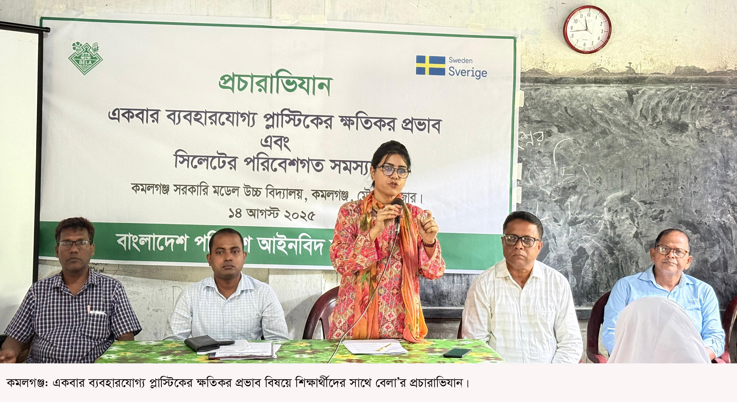 একবার ব্যবহারযোগ্য প্লাস্টিকের ক্ষতিকর প্রভাব ও সিলেটের পরিবেশগত সমস্যা নিয়ে শিক্ষার্থীদের সাথে সচেতনতামলক প্রচারাভিযান করেছে বাংলাদেশ পরিবেশ আইনবিদ সমিতি (বেলা), সিলেট। বহস্পতিবার (১৪ আগষ্ট) বেলা সাড়ে ১১টায় কমলগঞ্জ সরকারি বহুমখী মডেল উচ্চ বিদ্যালয়ের ৯ম ও ১০ম শ্রেনীর শিক্ষার্থীদের নিয়ে এই প্রচারাভিযান করা হয়।