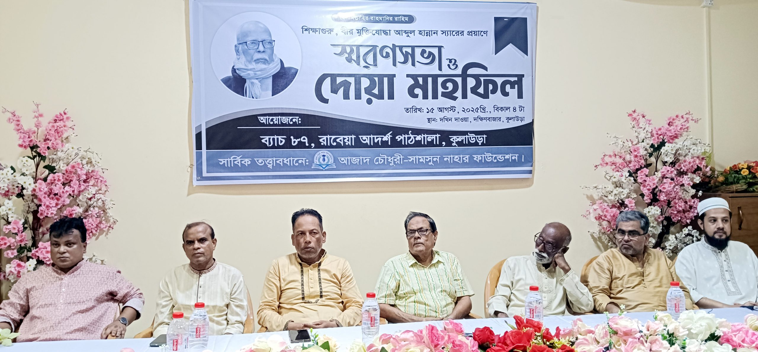 কুলাউড়া প্রতিনিধি ঃ মৌলভীবাজারের কুলাউড়ায় শিক্ষাগুরু, বীর মুক্তিযোদ্ধা আব্দুল হান্নানের প্রয়াণে স্মরণসভা ও দোয়া মাহফিল অনুষ্ঠিত হয়েছে। শুক্রবার (১৫ আগস্ট) বিকেল ৫টায় পৌর শহরের দক্ষিণবাজারস্থ দখিন দাওয়া হলরুমে রাবেয়া আদর্শ পাঠশালা ব্যাচ ৮৭’র আয়োজনে এ কর্মসূচি অনুষ্ঠিত হয়।