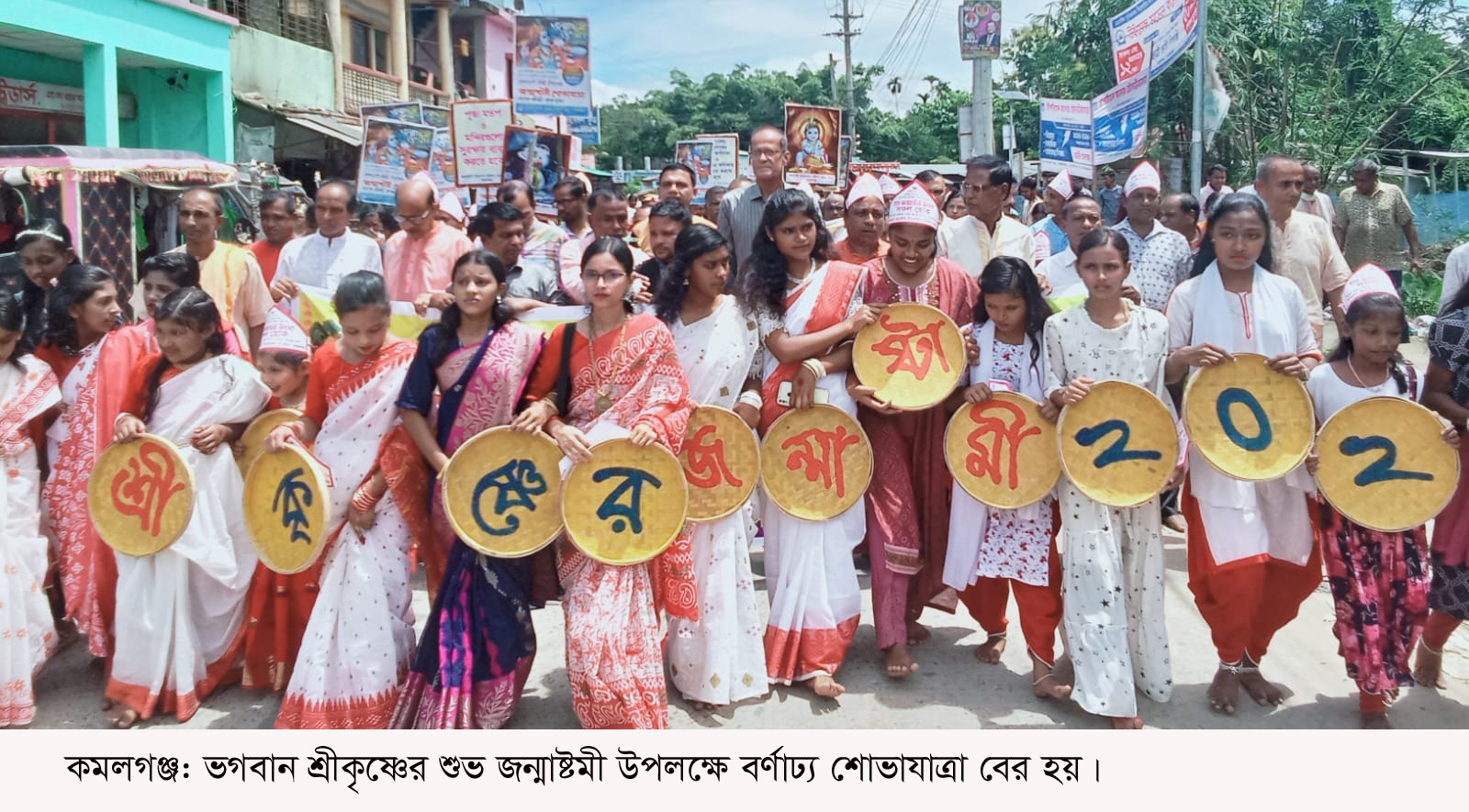মৌলভীবাজারের কমলগঞ্জে সনাতন ধর্মের প্রাণপুরুষ মহাবতার ভগবান শ্রীকৃষ্ণের শুভ জন্মাষ্টমী উৎসব পালিত হয়েছে। শনিবার (১৬ আগস্ট) বেলা ১১টায় জন্মাষ্টমী উদযাপন পরিষদ, কমলগঞ্জ এর আয়োজনে ভানুগাছ বাজারস্থ কমলগঞ্জ কেন্দ্রীয় শ্রীশ্রী দুর্গাবাড়ি প্রাঙ্গন থেকে এক মঙ্গল শোভাযাত্রা বের করা হয়।