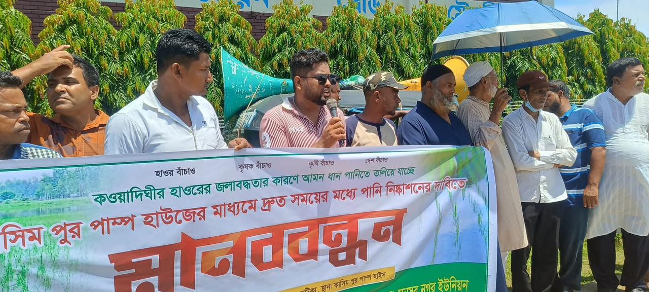 কাশিমপুর পাম্প হাউজের মাধ্যমে দ্রুত সময়ের মধ্যে হাওরের পানি নিস্কাশনের দাবিতে পাম্প হাউজের সামনে শনিবার (১৬ আগষ্ট) দুপুরে মানববন্ধন করেছে কয়েক ইউনিয়নের কৃষক। বিষেশ করে ৫নং আখাইলকুড়া ইউনিয়ন, ৬নং একাটুনা ইউনিয়ন, ১নং ফতেপুর ইউনিয়ন, ৮নং মনসুর নগর ইউনিয়ন-এর কৃষক ও স্থানীয় লোকজন উপস্থিত ছিলেন ।