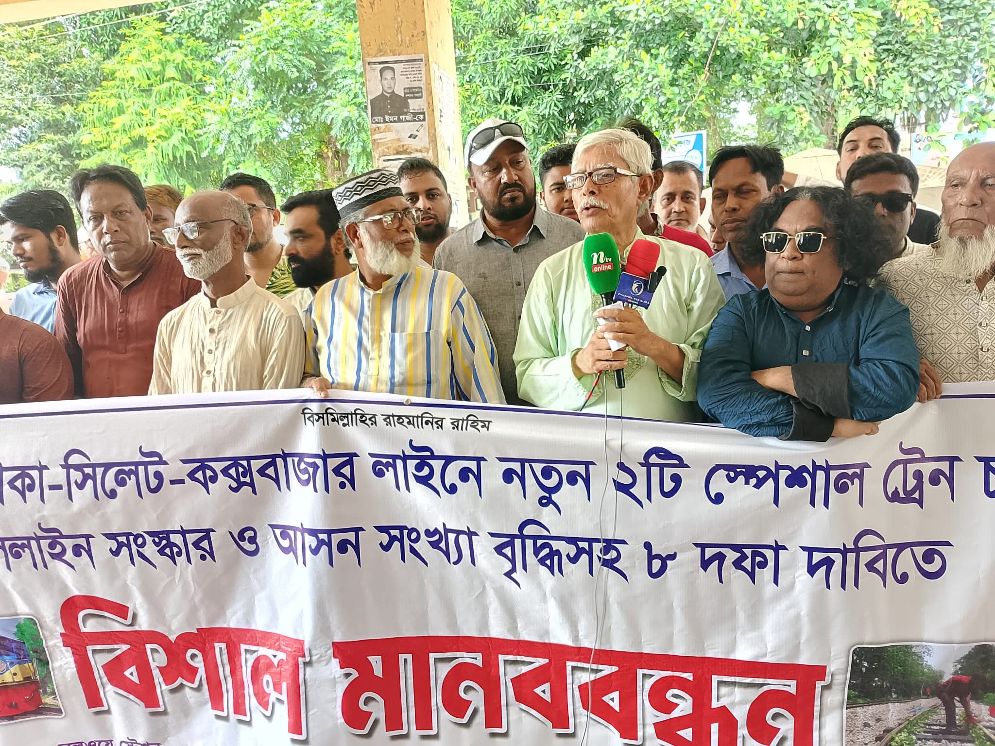 বাংলাদেশ রেলওয়ে সিলেট টু ঢাকা ও সিলেট টু কক্সবাজার রেলপথে নতুন দুটি ট্রেন চালু, রেলওয়ের সিলেট আখাউড়া লাইন সংস্কার, সিলেট থেকে ঢাকাগামী সকল আন্তঃনগর ট্রেন সমুহ আজিমপুরের পর যাএা বিরতি বাতিল,চলমান আন্তঃনগর ট্রেন সমুহে অতিরিক্ত বগি সংযোগ, আসন সংখ্যা বৃদ্ধি, সিলেট বিভাগের বন্ধ সকল রেলওয়ে ষ্টেশন চালু,যাএী হয়রানি ও টিকেট কালোবাজারি বন্ধ এবং রেলওয়ের সকল অনিয়ম দুর্নীতি বন্ধ সহ বৃহত্তর সিলেটবাসীর প্রানের দাবী চলমান ৮ দফা বাস্তবায়নের আন্দোলন দিন দিন তীব্র থেকে তীব্রতর আকার ধারণ করছে। মতবিনিময়, মানববন্ধন, প্রতিবাদ সমাবেশ, রেল মন্ত্রণালয়, রেলওয়ের বিভিন্ন দপ্তর সহ প্রশাসনের বিভিন্ন পর্যায়ে স্মারকলিপি প্রদান সহ ধারাবাহিক আন্দোলন কর্মসূচি চালিয়ে যাওয়ার পরেও এখন পর্যন্ত দৃশ্যমান কোন অগ্রগতি না হওয়ায় ক্ষোভে ফুঁসছে বৃহত্তর সিলেটের মানুষ। ইতিমধ্যে সিলেট, কুলাউড়া, শ্রীমঙ্গল, ভাটেরা ও টিলাগাও সহ সিলেট বিভাগের বিভিন্ন ষ্টেশনে মানববন্ধন সহ বিভিন্ন ধারাবাহিক কর্মসূচি পালিত হয়েছে।