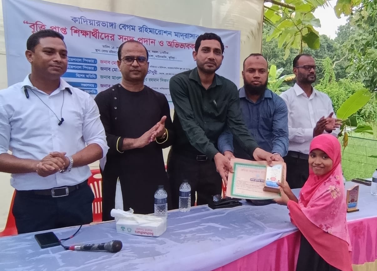 কুমিল্লার দাউদকান্দি উপজেলার কাদিয়ারভাঙ্গা বেগম রহিমারোশন মাদরাসার বৃত্তি প্রাপ্ত শিক্ষার্থীদের সনদ প্রদান ও অভিভাবক কাউন্সেলিং অনুষ্ঠিত হয়েছে।রবিবার সকাল ১০টায় মাদরাসা মাঠে এই অনুষ্ঠান সম্পন্ন হয়।