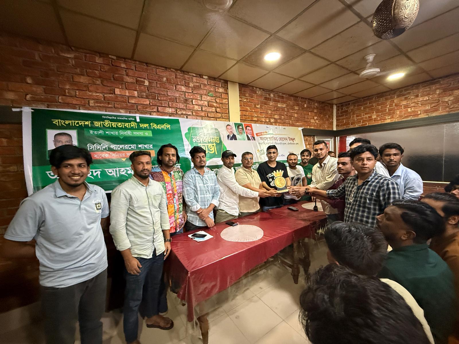 সভা শেষে সংবর্ধিত ব্যক্তিত্ব আসাহিদ আহমদ মোসাহিদ কে সম্মাননা স্মারক প্রদান করে মৌলভীবাজার পৌর ও সরকারী কলেজ ছাত্রদলের নেতৃবৃন্দ।